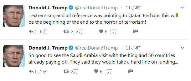 美媒稱,特朗普在推特上發表一系列評論説,他最近訪問沙特阿拉伯並與穆斯林國家領導人會面時指出,卡塔爾是恐怖分子的一個資金來源。他説,他與沙特國王和50個穆斯林國家元首會談,呼籲建立團結陣線,共同打擊恐怖主義,他“高興地看到”,會談“已經在産生效果”。