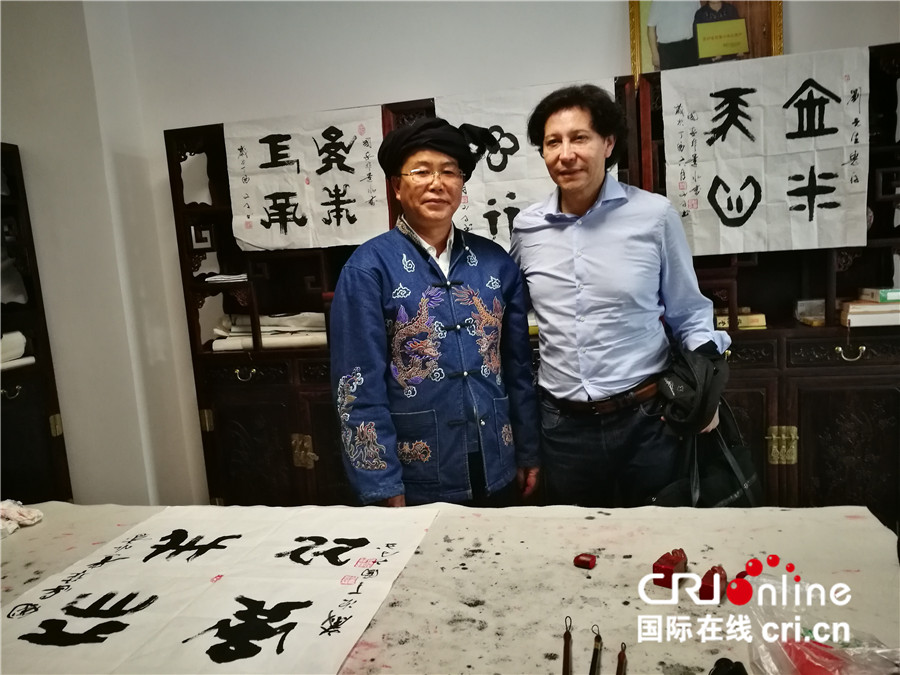 卡洛斯在貴州省三都縣水族文化博物館與西班牙國際電臺做連線
