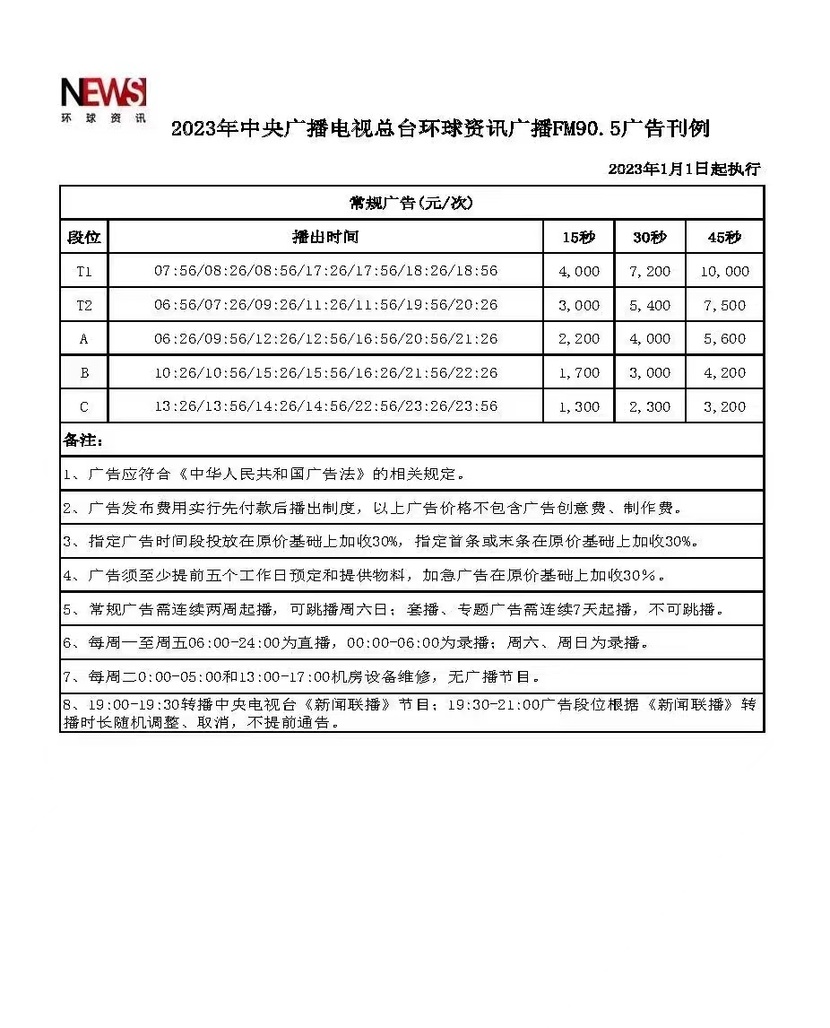 2023年中央廣播電視總臺環球資訊廣播FM90.5廣告刊例