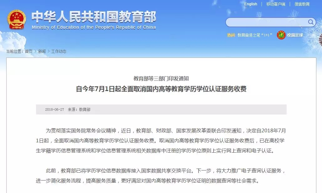 為貫徹落實國務院常務會議精神,近日,教育部、財政部、國家發展改革委聯合印發通知,決定自2018年7月1日起,全面取消國內高等教育學歷學位認證服務收費。