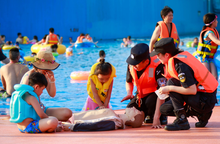 Police officers teach children how to resuscitate a drowning person in Taizhou, Jiangsu province. [Photo provided to China Daily]