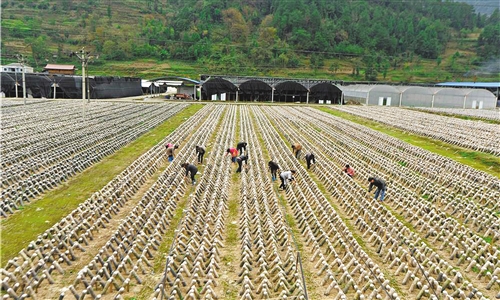 敖寨鄉村民在木耳基地整理菌棒。 經濟日報-中國經濟網記者 王新偉攝