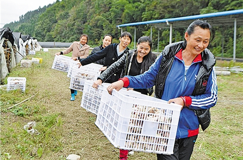 在産業園區打工的村民搬運香菇。經濟日報-中國經濟網記者 王新偉攝