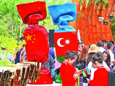 在阿塞拜疆展園入口處,有一件由兩塊糖果造型的雕塑作品,上面分別印有中國和阿塞拜疆兩國國旗,象徵著兩國友好的關係。光明日報記者郭紅松攝/光明圖片