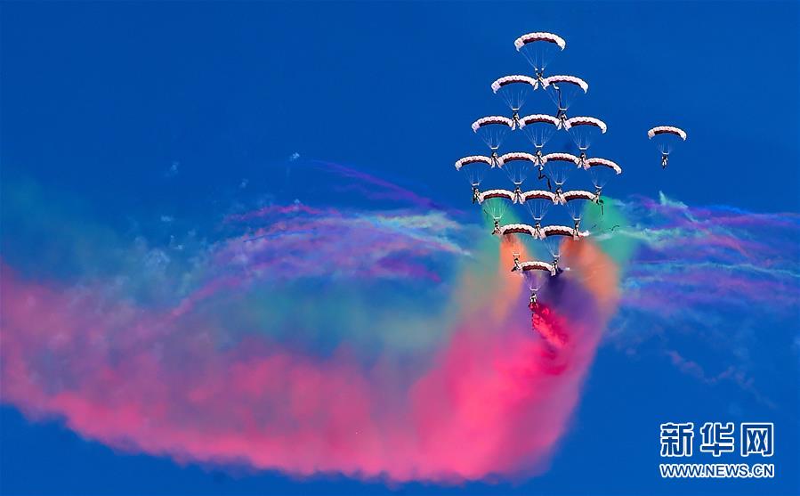 1月15日,在科威特費爾瓦尼耶省舉行的第二屆科威特航空展上,表演者進行編隊跳傘表演。