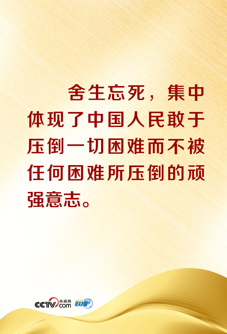 “在這場同嚴重疫情的殊死較量中,中國人民和中華民族以敢於鬥爭、敢於勝利的大無畏氣概,鑄就了生命至上、舉國同心、捨生忘死、尊重科學、命運與共的偉大抗疫精神。”總書記還在講話中特別概括、闡釋了偉大抗疫精神,並深刻指出,偉大抗疫精神,同中華民族長期形成的特質稟賦和文化基因一脈相承,是愛國主義、集體主義、社會主義精神的傳承和發展,是中國精神的生動詮釋,豐富了民族精神和時代精神的內涵。央視網《聯播+》欄目特對相關內容進行梳理,與您共同在偉大精神中感受偉大的力量!