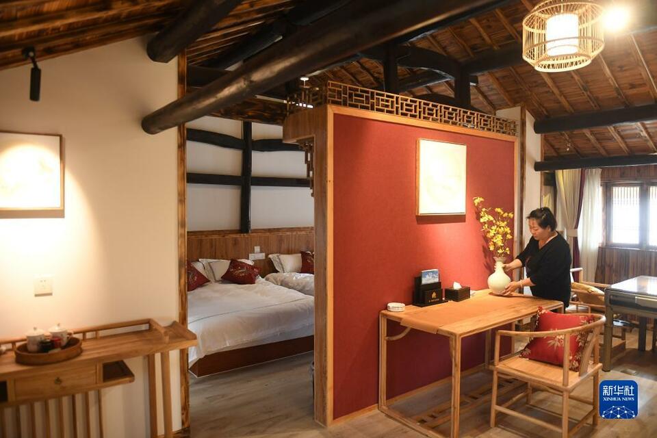 服務員在浙江省磐安縣烏石村一家民宿內整理房間(2019年4月24日攝)。新華社記者 翁忻旸 攝