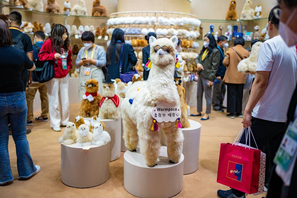 △2022年11月9日,第五屆中國國際進口博覽會展區正式開放。秘魯展商的羊駝玩偶,蓬鬆柔軟、形態各異的動物玩偶在展臺“列隊”,吸引大批觀眾前來交流洽談。