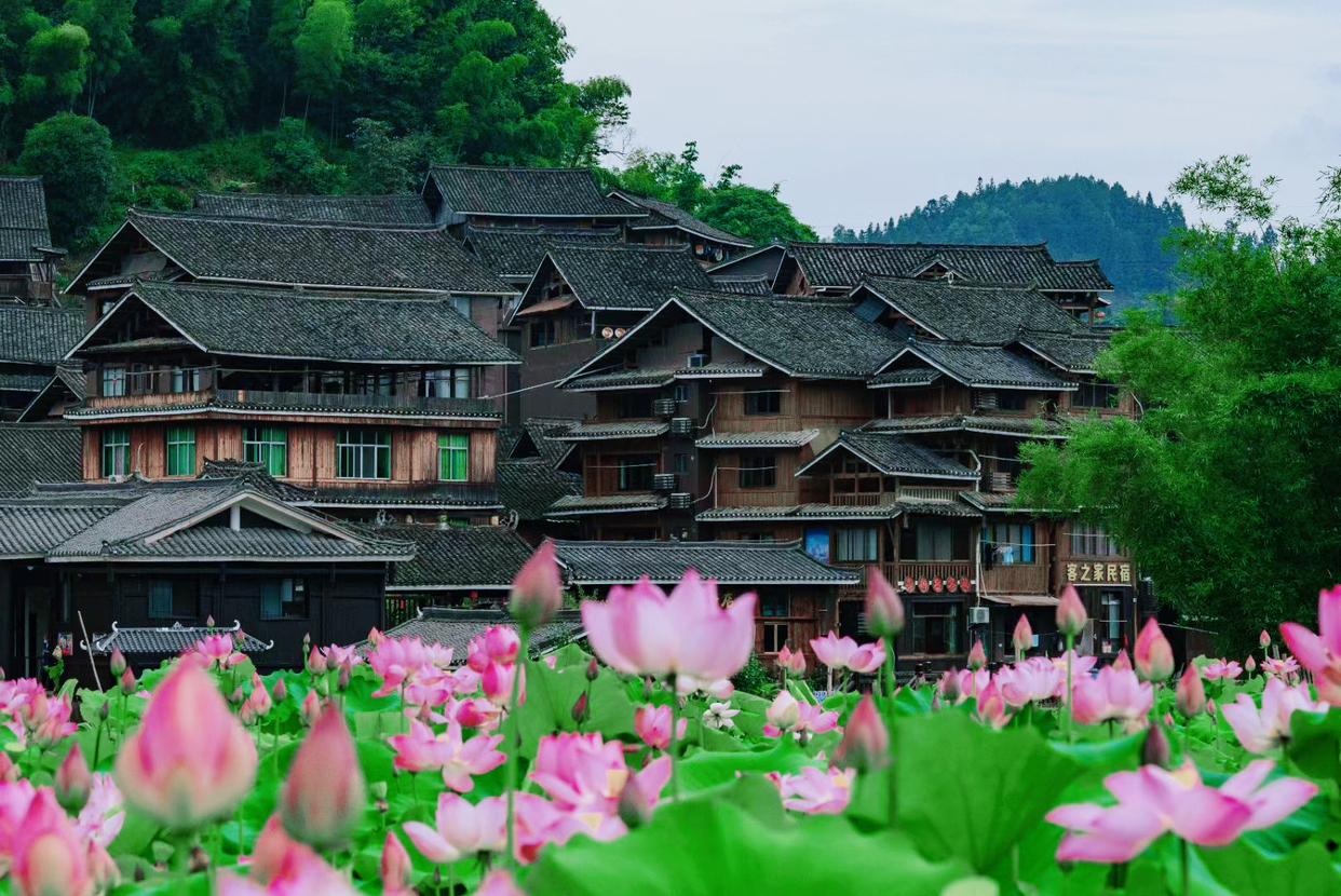Sanjiang Dong Autonomous County, Guangxi, Chengyang Bazhai has a pool of fragrant lotus flowers. The blooming lotus flowers, along with the Wind and Rain Bridge, Drum Tower, and stilted wooden houses in the Dong Village, make for the most beautiful scenery in June.