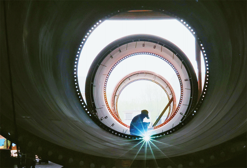 2023年一季度,我國國內生産總值同比增長4.5%,國民經濟開局良好,為實現全年發展目標奠定了基礎,注入了信心。圖為2023年4月18日,工人在江蘇連雲港經濟技術開發區一家公司內加工組裝風電塔筒。 中新社發 耿玉和/攝