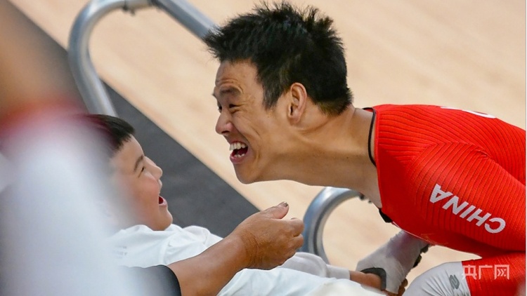 2023年10月23日,杭州第4屆亞殘運會場地自行車賽場,來自杭州選手李樟煜和他的混合團體C1-5750M競速賽隊友,在家門口奪冠。得冠後李樟煜激動不已,深情親吻觀眾席上7歲的兒子李沐辰,相互擁抱鼓勵,父愛燃爆賽場。(圖片來源:CFP)