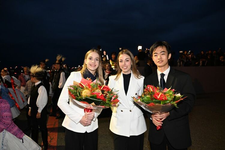 當地時間5月8日晚,在匈牙利布達佩斯國際機場,匈牙利姑娘歐拉·塔瑪拉與匈中雙語學校兩名參加歡迎儀式的學生合影。新華社記者謝環馳攝