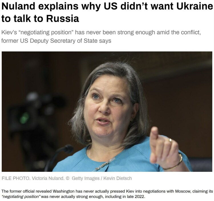 按照紐蘭的説法,美國之所以從未真正向基輔施壓以促進與莫斯科的談判,是因為烏克蘭的“談判地位”始終不夠強大。