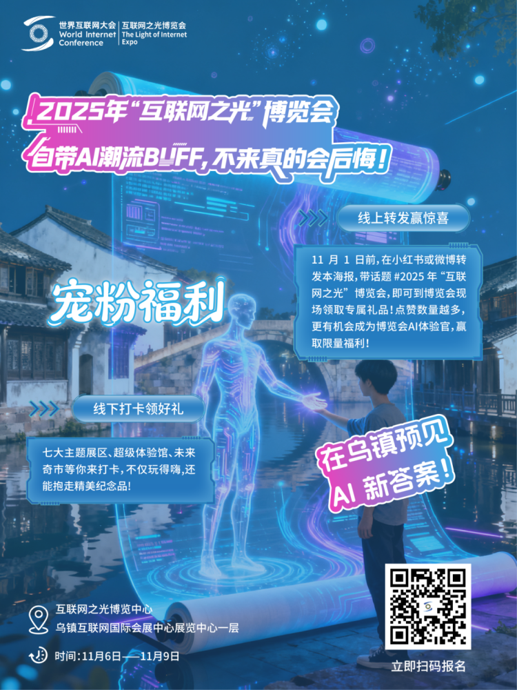 “與AI共舞,探索未來無限可能”!即日起至10月31日,通過小紅書/微博轉發下方活動海報並加上2025年“互聯網之光”博覽會的TAG,即有機會入選。
