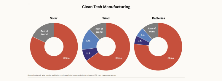 2023年太陽能電池、風力機艙和電池單元製造産能的佔比圖(來自《耶魯環境360》網站)