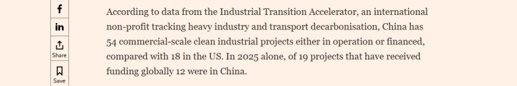 文章援引追蹤重工業和交通運輸脫碳的國際非營利組織“工業轉型加速器”(Industrial Transition Accelerator)的數據報道稱,中國目前有54個商業規模的清潔工業項目已投入運營或獲得融資,而美國為18個。僅2025年,全球已獲得融資的19個項目中,就有12個位於中國。