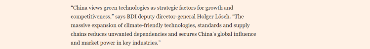 文章援引德國工業聯合會(BDI)副總幹事霍爾格·勒施的話表示,“中國將綠色技術視為經濟增長和競爭力的關鍵因素。中國在氣候友好型技術、標準和供應鏈等方面的大規模擴張,減少了不必要的對外依賴,並鞏固了其在關鍵行業的全球影響力和市場地位。”