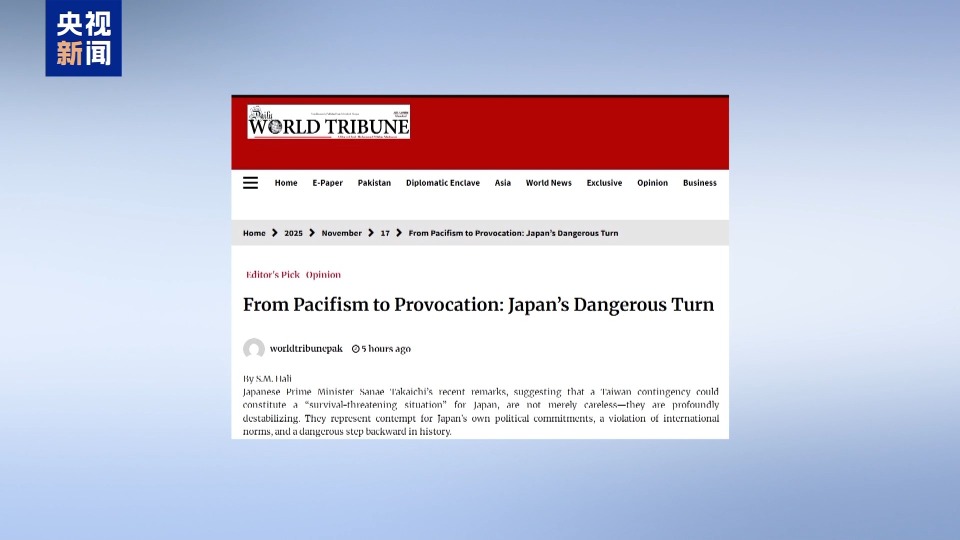 巴基斯坦國際問題專家蘇爾坦·哈利在《世界論壇報》刊文指出,日本首相高市早苗的言論不僅違反了日本的政治承諾,也是一種危險的挑釁,威脅地區和平。亞洲承受不起重蹈軍國主義覆轍的代價,日本必須牢記其承諾。