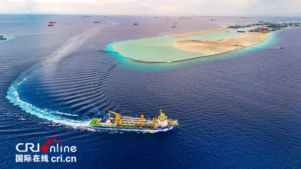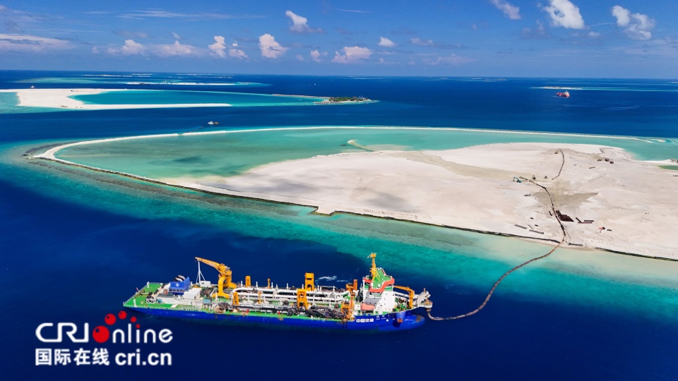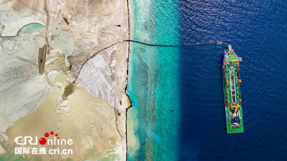 圖片記錄的是中交廣航局旗下亞洲最大耙吸式挖泥船“浚洋1”在馬爾代夫AYLA酒店吹填項目開工時的精彩時刻。本項目總共需要完成28個大小島嶼的吹填造地施工,最終形成環繞迪古法魯環礁一圈的島鏈。待項目完工,擁有白色細軟沙灘的島鏈會像是漂浮在“玻璃海”上的一串珍珠,為酒店後續建設創造更多的想像空間。