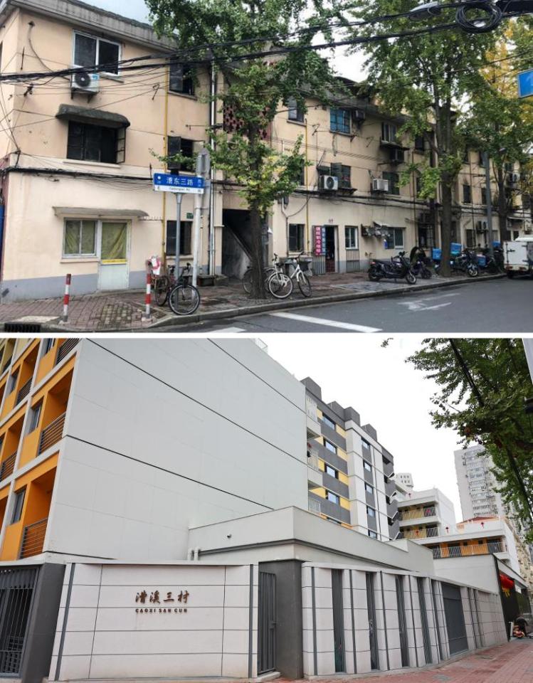 拼版照片:上圖是改造前的上海市徐匯區漕溪三村小區居民樓外景(資料照片,新華社發);下圖是拆除重建後的漕溪三村小區居民樓外景(2025年10月23日攝,新華社記者方喆 攝)