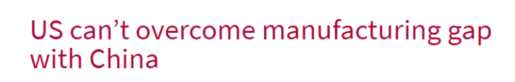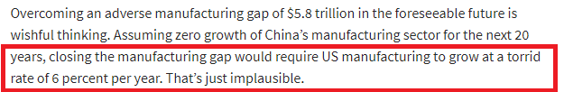 文章最後説,在可預見的未來,想要彌合美中製造業産值的巨大差距,簡直是癡人説夢。假設未來20年中國製造業規模零增長,美國製造業想要彌合差距,就必須以每年6%的驚人速度增長,而這根本不可能。