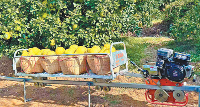 南福金柚種植基地,單軌山地果園運輸機正在工作中。
