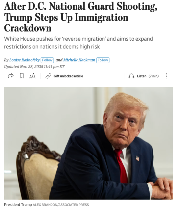 △《華爾街日報》報道,國民警衛隊員遭槍擊事件後,美國總統特朗普加大力度倡導“反向移民”議程,旨在擴大對來自貧困國家的移民的打擊。