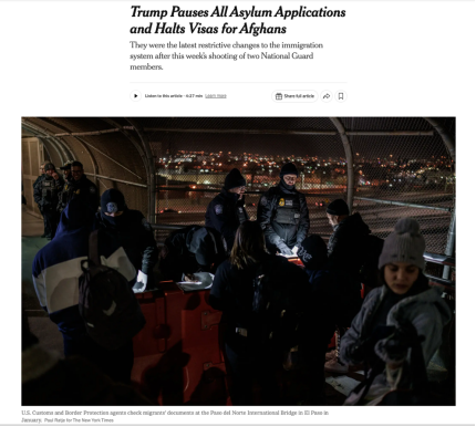 △《紐約時報》報道,特朗普政府目前暫停了對所有庇護申請的審批,並停止了向阿富汗人發放簽證。