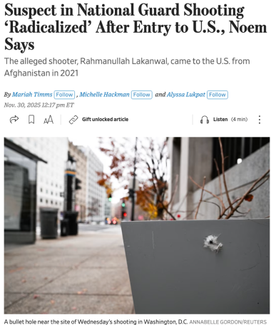 △《華爾街日報》稱,諾姆表示,槍擊國民警衛隊員的嫌疑人很可能是在進入美國後才變得觀點激進,而他們也將調查嫌疑人接觸的所有人員。