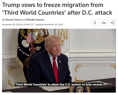 △路透社報道,美國總統特朗普宣佈將“永久暫停”來自所有“第三世界國家”的移民。