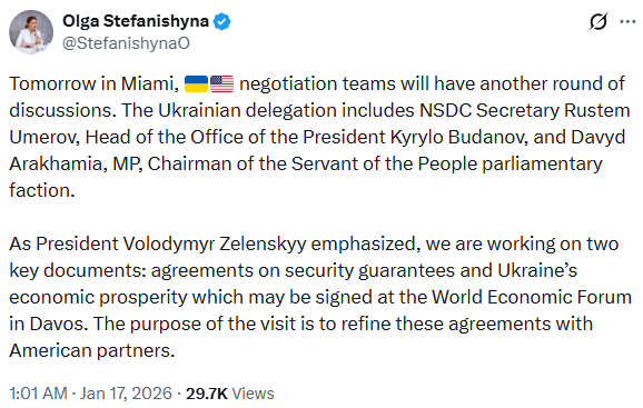 烏克蘭總統澤連斯基當地時間16日在烏首都基輔舉行的一場聯合記者會上説,烏方此次派團赴美會談,希望得到更明確的信息,既關於上述兩份協議,也關於俄羅斯方面對目前外交努力的反饋。澤連斯基強調,如此次會談能最終敲定美國對烏安全保障協議和烏克蘭經濟繁榮協議,那麼他和美國總統特朗普有望在達沃斯簽署這兩份協議,但前提是美方需提供永久安全保障,且烏方能夠獲得切實的金融支持。