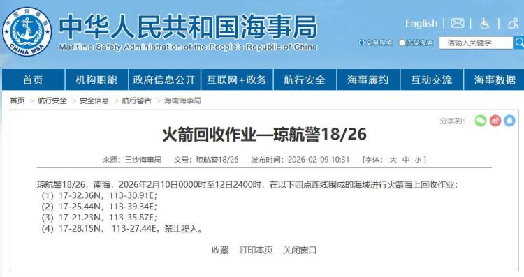 國際在線報道:據中國海事局網站消息,三沙海事局發佈航行警告,2月10日0時至12日24時,南海部分海域進行火箭海上回收作業,禁止駛入。