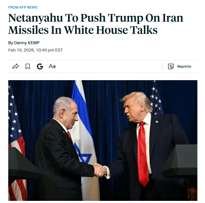 當地時間2月10日晚,內塔尼亞胡在白宮與美國總統特朗普的特使威特科夫和女婿庫什納舉行會晤,討論伊朗局勢。威特科夫和庫什納向內塔尼亞胡通報了美國和伊朗2月6日在阿曼首都馬斯喀特舉行間接談判的情況。