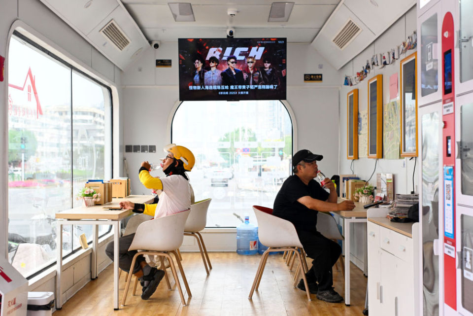 2025年6月9日,幾名戶外勞動者在天津市河西區文化中心工會驛站休息。2025年12月發佈的數據顯示,全國已建工會驛站18萬個、貨車司機之家2187個,有效解決勞動者“吃飯難、喝水難、休息難、如廁難”等現實問題。