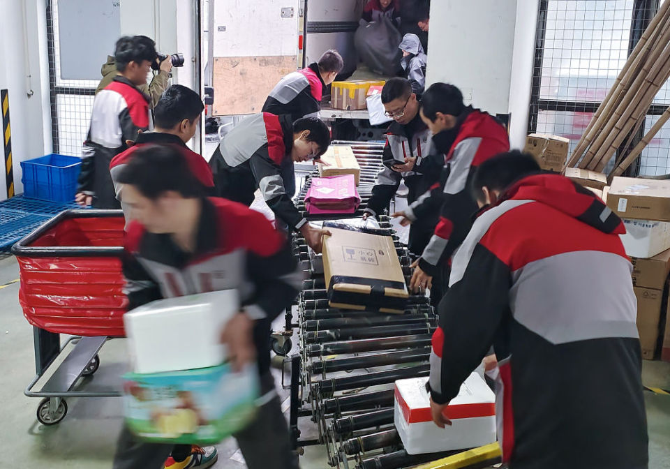 2023年11月11日,浙江省寧波市寧海縣的快遞員在分揀快遞。