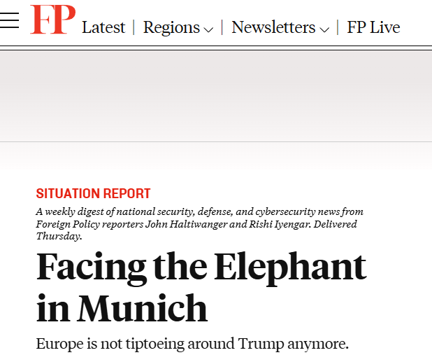 美國《外交政策》雜誌發文稱,2026慕尼黑安全會議已浮現明確主題:歐洲領導人毫不諱言二戰後國際秩序已然崩潰的論斷,並將矛頭直指美國總統特朗普。德國總理默茨在開幕日直言基於規則的世界秩序“不復存在”,稱“歐美之間已出現深刻裂痕”。但他同時強調雙方仍需彼此:“在大國競爭時代,即便是美國也不具備單打獨鬥的實力。”