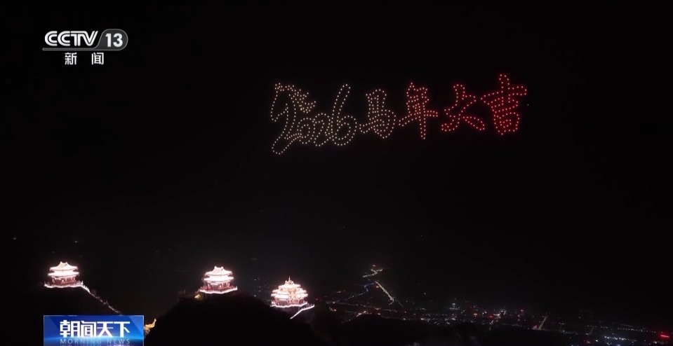 夜幕降臨,千架無人機匯聚成流動的星河,在夜空中靈活穿梭。依次勾勒出奔跑的駿馬、祥瑞的鳳凰,“2026 馬年大吉”等字樣在天空中織就漫天星光。