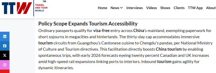 《旅行和旅遊世界》網站報道指出,這一停留時長足以支持外國遊客規劃深度旅行線路。預計北京長城、故宮,上海外灘,西安兵馬俑等知名景點將迎來大量外國遊客,而品嘗廣州粵菜、赴成都開啟熊貓之旅等特色文化體驗,也可納入行程。