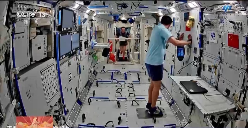 歡樂的文藝表演過後,航天員也要開展日常生活與工作,鍛鍊身體就是其中一項。