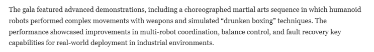 文章指出,在春晚節目中一段精心編排的武術表演中,人形機器人展示了複雜的動作,並模擬了“醉拳”技巧。該表演展示了多個機器人協作、平衡控制以及故障恢復等關鍵能力的提升,也展示了中國如何將産業政策、文化傳播以及市場發展整合為統一的創新策略。