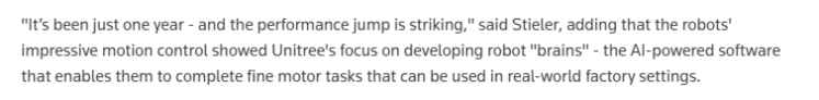 路透社則援引科技諮詢公司施蒂勒(Stieler)機器人與自動化業務負責人喬治·施蒂勒(Georg Stieler)的觀點稱,僅僅一年的時間,中國機器人性能的提升令人矚目。他指出,這些機器人出色的運動控制能力展示了中國科技企業在開發機器人“大腦”方面的專注程度——即那些由人工智能驅動的軟體,它們能夠幫助機器人完成精細的操作任務,這些任務可在實際的工廠環境中發揮作用。