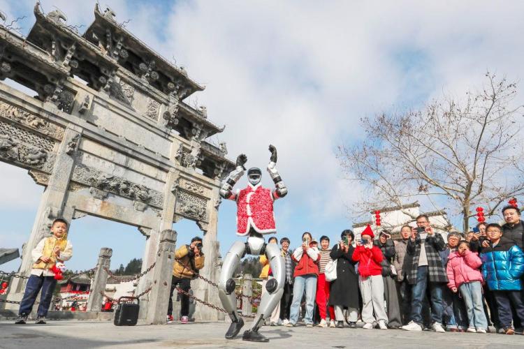 △2026年2月18日,遊客在安徽黟縣西遞古村觀看機器人表演。