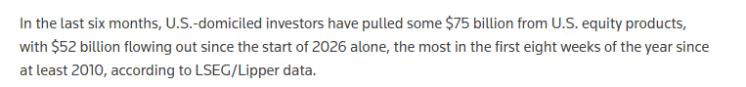 文章説,隨著科技巨頭回報率下降而海外市場表現更優,美國投資者正以至少十六年來最快速度撤離本土股市。倫敦證券交易所集團(LSEG)數據顯示,過去六個月美國投資者從本土股票産品中撤資約750億美元,其中僅2026年前八周就流出520億美元,創2010年以來年初同期最高紀錄。