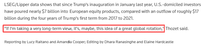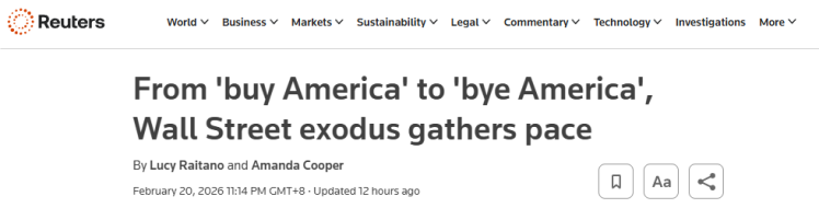 英國路透社近日發表題為《從“買入美國”(Buy)到“告別(Bye)美國” 華爾街資金外流加速》的文章。