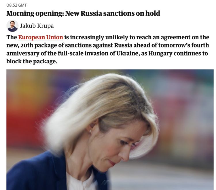 歐盟外交與安全政策高級代表卡拉斯23日表示,因匈牙利持續反對,歐盟當天恐難以通過第20輪對俄制裁方案。