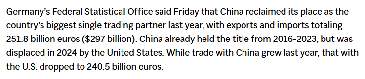 美聯社的報道稱,德國聯邦統計局當地時間2月20日公佈的數據顯示,2025年中國重新奪回德國最大單一貿易夥伴的地位,兩國進出口總額達2518億歐元。中國此前曾于2016年至2023年保持這一地位,但2024年被美國取代。文章稱,去年德中貿易額有所增長,但德國與美國的貿易額卻下降至2405億歐元。