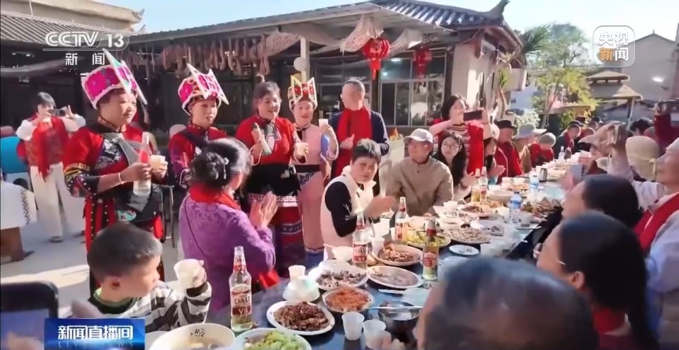 普者黑在彝族語言裏意思是盛滿魚蝦的湖泊。當地最具民族特色的是長街宴,18道菜肴擺滿長桌,30桌彝族宴席接成長龍。在悠揚的祝酒歌聲中,來自各地的老人們歡聚一堂,觀賞民族歌舞展演、參與傳統民俗活動,沉浸式感受濃郁年味。
