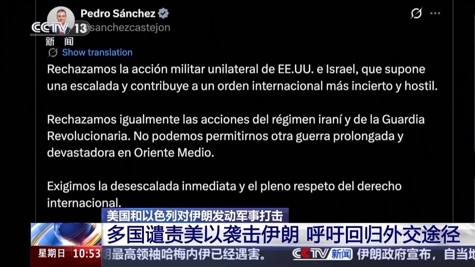 西班牙首相桑切斯在社交媒體上説,西班牙反對美國和以色列採取的單邊軍事行動,認為這將導致局勢升級,並使國際秩序更加不確定。