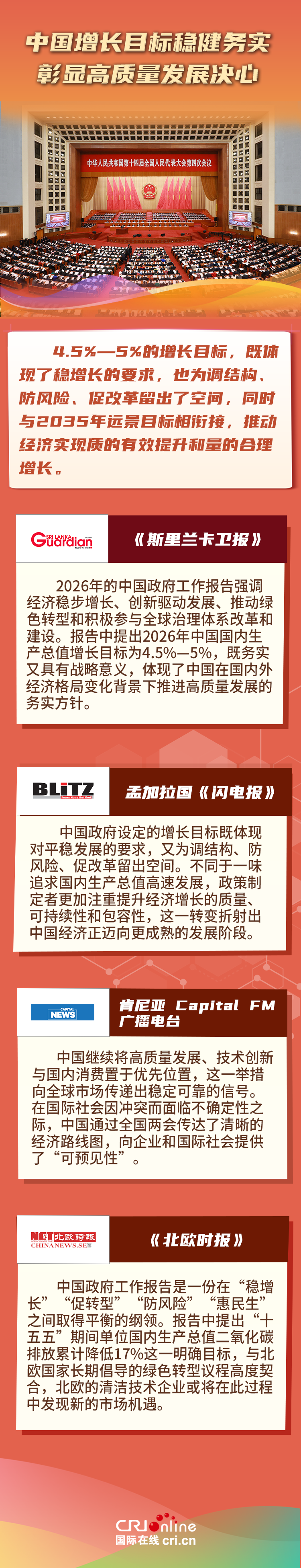 國際在線專稿:2026年是“十五五”開局之年,政府工作報告公佈中國今年經濟增長預期目標為4.5%—5%。對此,多家外媒指出,中國設定的國內生産總值增長目標是一項穩健、務實的戰略選擇,既體現了在複雜環境下對“穩增長”與“防風險”的精準平衡,也彰顯了中國通過高品質、可持續發展為充滿不確定性的世界注入寶貴的確定性。