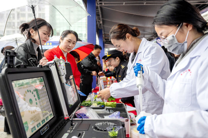 在浙江省湖州市長興縣放心消費嘉年華公益活動現場,該縣食品藥品檢驗檢測中心工作人員為市民提供免費果蔬檢測服務(2025年3月15日攝)。新華社發(譚雲俸 攝)